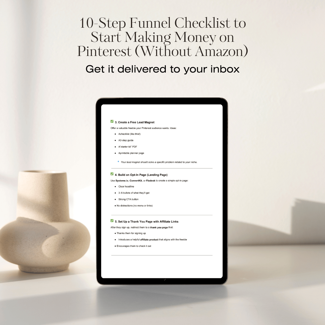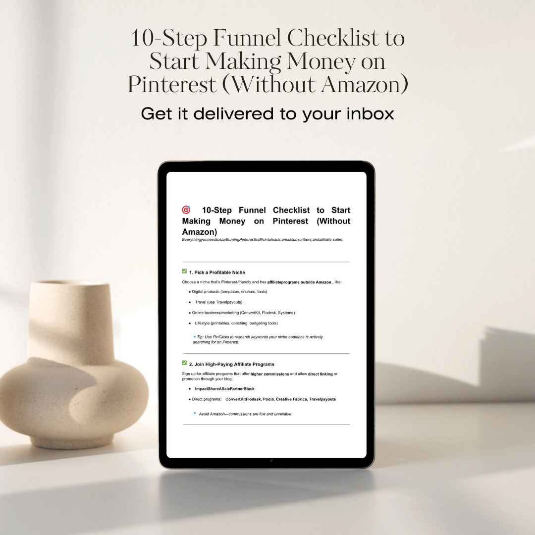 This 10-step checklist walks you through the same strategy I use to make money from Pinterest using digital products and affiliate links (no fancy tech or ad spend required).